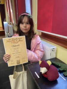 A néptáncos és a zenei program mellett még egy izgalmas diák kiállítás is volt ezen az eseményen. Népszerű lett az a kezdeményezésem, miszerint az Alapfokú Művészeti Iskola Képzőművészeti tagozatán alkotó diákjaim is beadhatnak alkotásokat erre az eseményre, megmérettetve a szakmai zsűri előtt. A díjnyertes diákjaim a következők lettek: Klubuk Tessza 3.a., Bollók-Spiller Adél 3.b., Holota Zétény 3.b., Bordás Hanna 6.b. Amikor Tessza eldöntötte, hogy az elég bonyolult rókát fogja nemezfilcből megvarrni, kicsit meglepődtem, és tartottam attól, hogy menet közben fel fogja adni a küzdelmet és abba fogja hagyni a munkát. De nem így történt, hanem Tessza hétről hétre elővette a róka elemeit és lelkesen tanulmányozva az instrukciókat haladt szépen lépésről lépésre. Egy elakadásunk volt a végén, amikor sehogy sem tudtunk rájönni, hogy a kisebb darabok a fejen hogyan illeszkednek pontosan – de akkor odalépett Pötty (Ádám Anna), és addig forgatta, illesztette a kritikus területet, hogy végül gyönyörűen összeállt a róka feje. Adél az egyik legkreatívabb diák a Képzős tagozaton – akár nálam van a fakultáción, akár otthon van, neki muszáj valami újat, valami nagyon eredetit létrehoznia. Most egy „Mikro Modellt” hozott a kiállításra, amely alkotás Kósa Klára zsűri elnököt rögtön elvarázsolta. Zéti mázas, hóvirágos domborművét szintén Kósa Klára választotta ki a többi, szintén gyönyörű alkotás közül. Hanna egy kifejező, viszonylag nagy méretű maszkot készített erre az alkalomra – neki is gratulálunk a szép eredményéért! Akik zsűriztek – nemcsak a diák kategóriában: Kósa Klára, Lengyel Rita, Béres Gabriella és Várbiró Kinga.