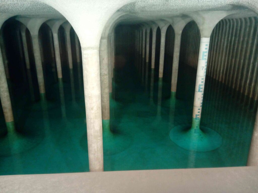 Vezetett látogatás volt számunkra. Minden évben ezen alkalommal nyitják meg a közönség számára a medencét látogatásra. Az előtérben maketteken bemutatták a medence felépítését, a csápos kutak működését és a tároló építési szakaszait. Rövid előadás volt a gyerekek számára, a végén az ellenőrző ablakokon keresztül be lehetett nézni a medence belsejébe. A nagy tartó oszlopokon látható volt a vízszint beosztása nyolc méteres magasságig.